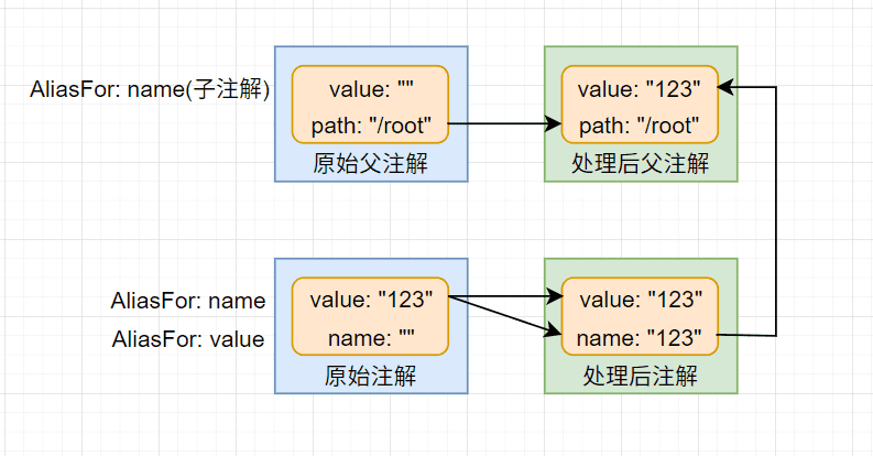 注解别名 指的注解的属性拥有别名的功能,让多个属性值表达同一个意思,如 Spring 的 @Bean 注解:
